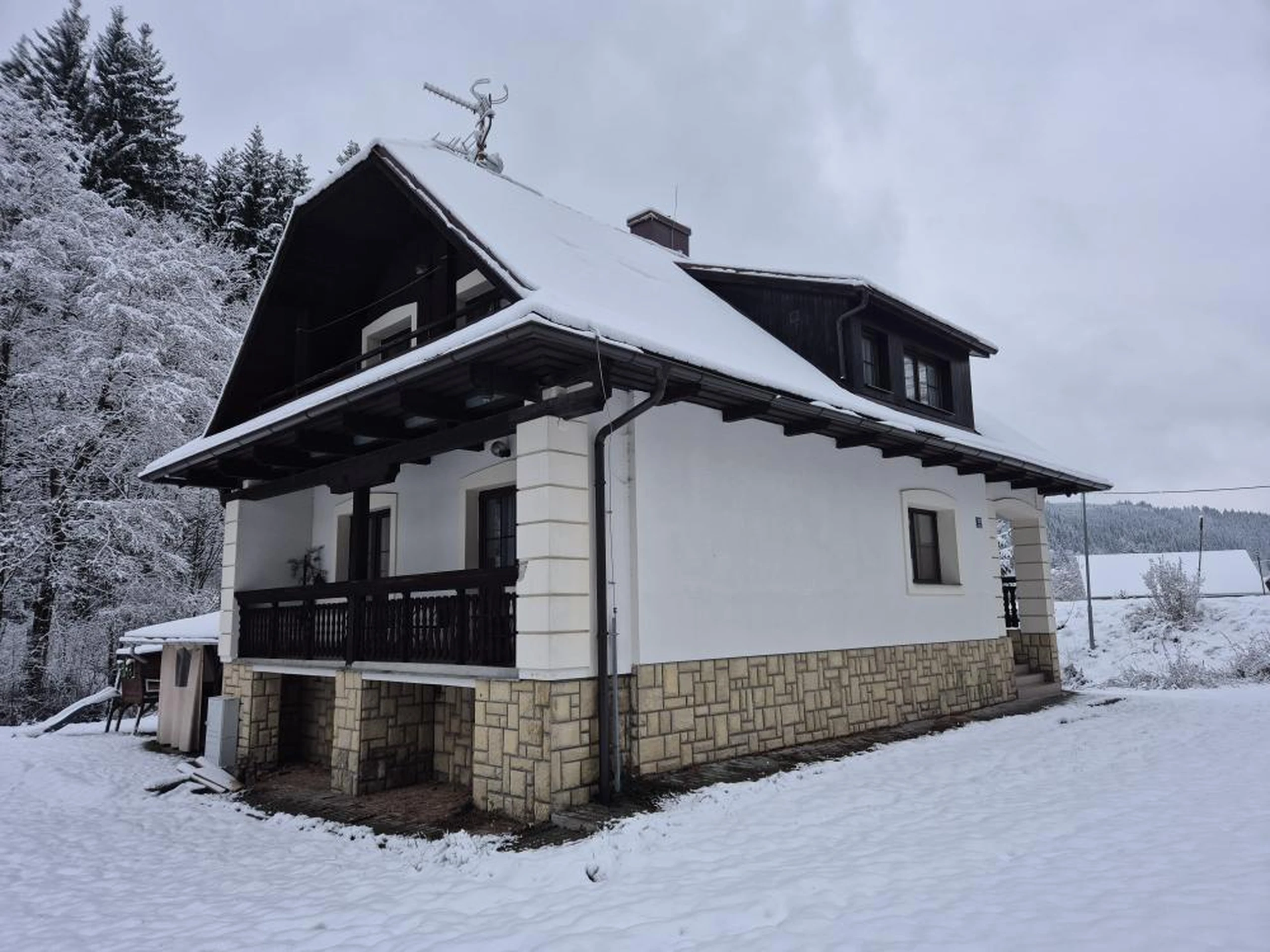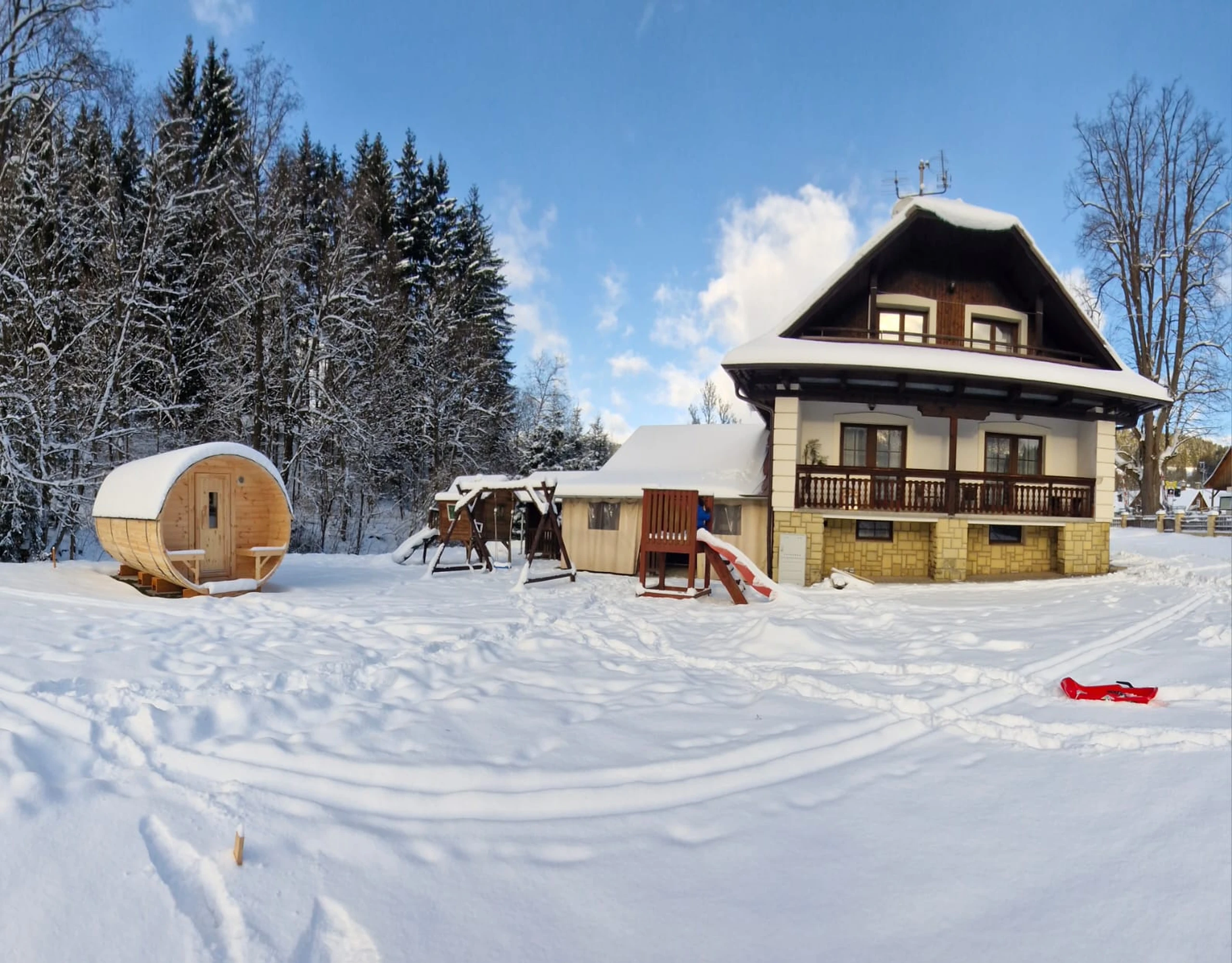 Apartmán 3 Liščí doupě je útulné a praktické ubytování až pro 4 osoby, ideální pro páry, menší rodiny nebo samostatné cestovatele. Jedná se o větší pokoj s manželskou postelí, pohodlným posezením a přistýlkou. Pokoj disponuje koupelnou s vanou a WC, televizí, wi-fi a krásným výhledem. Společné zázemí společenské místnosti s plně vybavenou kuchyní a barem, které potěší malé i velké hosty, se nachází v přízemí. Po dni plném zážitků si můžete odpočinout na zahradě nebo u společného grilu.